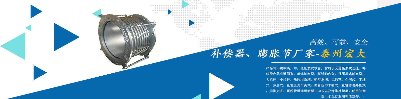 泰州市宏大機械設備有限公司是一個企業(yè)內部管理嚴謹,工作作風穩(wěn)健,職工素質水平較高,經濟實力雄厚,產品質量放心,外部形象良好的企業(yè)。本公司專業(yè)從事補償器廠家,膨脹節(jié)廠家,膨脹節(jié)補償器,其中有不銹鋼高,中,低壓波紋軟管,材質以及連接形式任選。補償器產品有通用型,單試軸向型,復試軸向型,外壓單式軸向型,大拉桿,小拉桿,熱網用系統(tǒng),矩形系統(tǒng),無約束,全埋式,半埋式,多層式,直管壓力平衡式,曲管壓力平衡…...
